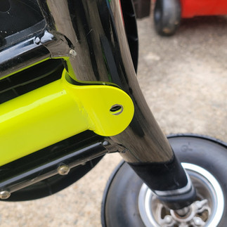 The rear axle bolt it's difficult to access if the seat is all the way back. Slots in the yellow frame can be cut to allow the axle bolts to slide out of the frame. When the front bolt is in, it prevents the axle/seat frame from sliding out the slots.